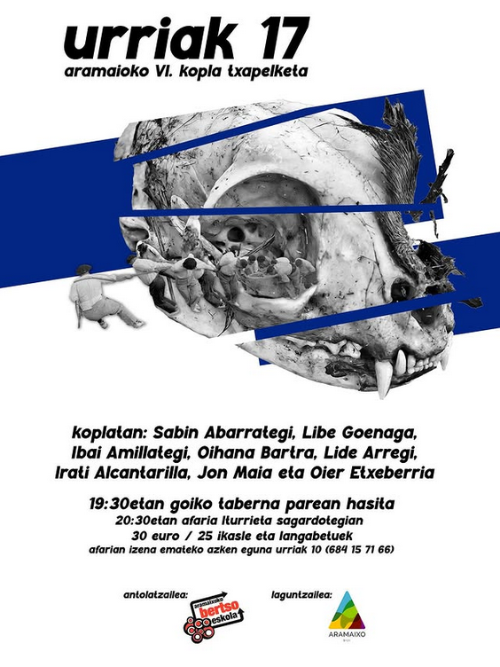 Aramaioko Kopla Txapelketaren VI. edizioa jokatuko da urriaren 17an. Zortzi bertsolari ariko dira kantuan eta bi saiotan banatuko da ekitaldia. Arratsaldean, 19:30etan, kalean egiten da lehen zatia kopla hutsean eta afalondoan bigarrena, koplak musikaz lagunduta. Aurten, Iturrieta sagardotegian izango da afaria. Zortzi bertsolari ariko dira kantuan: Sabin Abarrategi, Libe Goenaga, Ibai Amillategi, Oihana Bartra, Lide Arregi, Irati Alcantarilla, Jon Maia eta Oier Etxeberria. Bertso eskolak antolatzen du eta bertako kideak aritzen dira gai-jartzen.