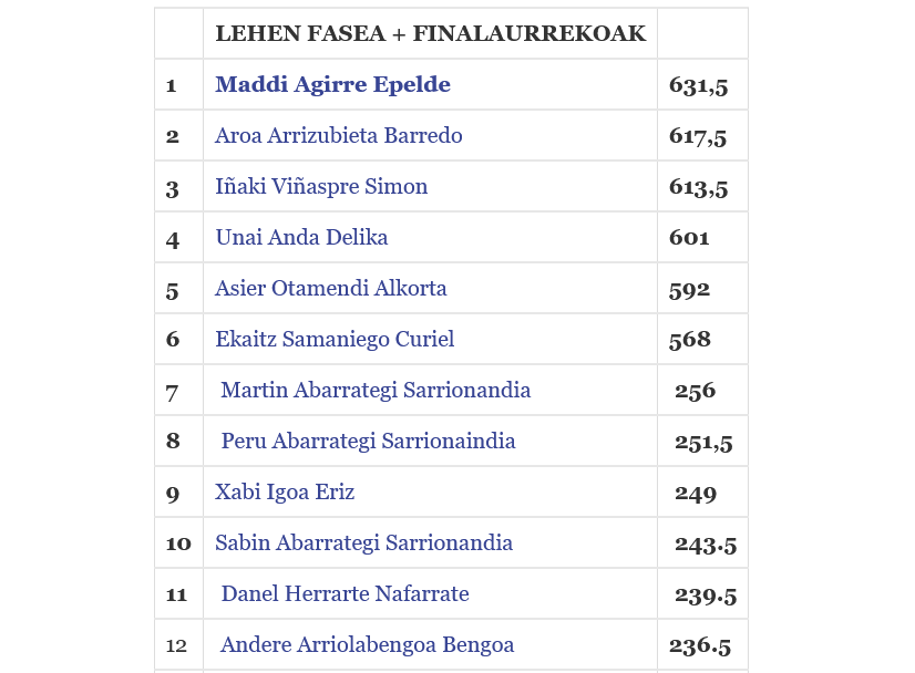 Aramaioko saiotik Martin Abarrategik du puntuaziorik alduena (256); Peru Abarrategi dago bigarren (251,5) eta Xabi Igoa (249) hirugarren. Gertu, Sabin Abarrategi (243), Danel Herrarte (239) eta Andere Arriolabengoa (236,5).